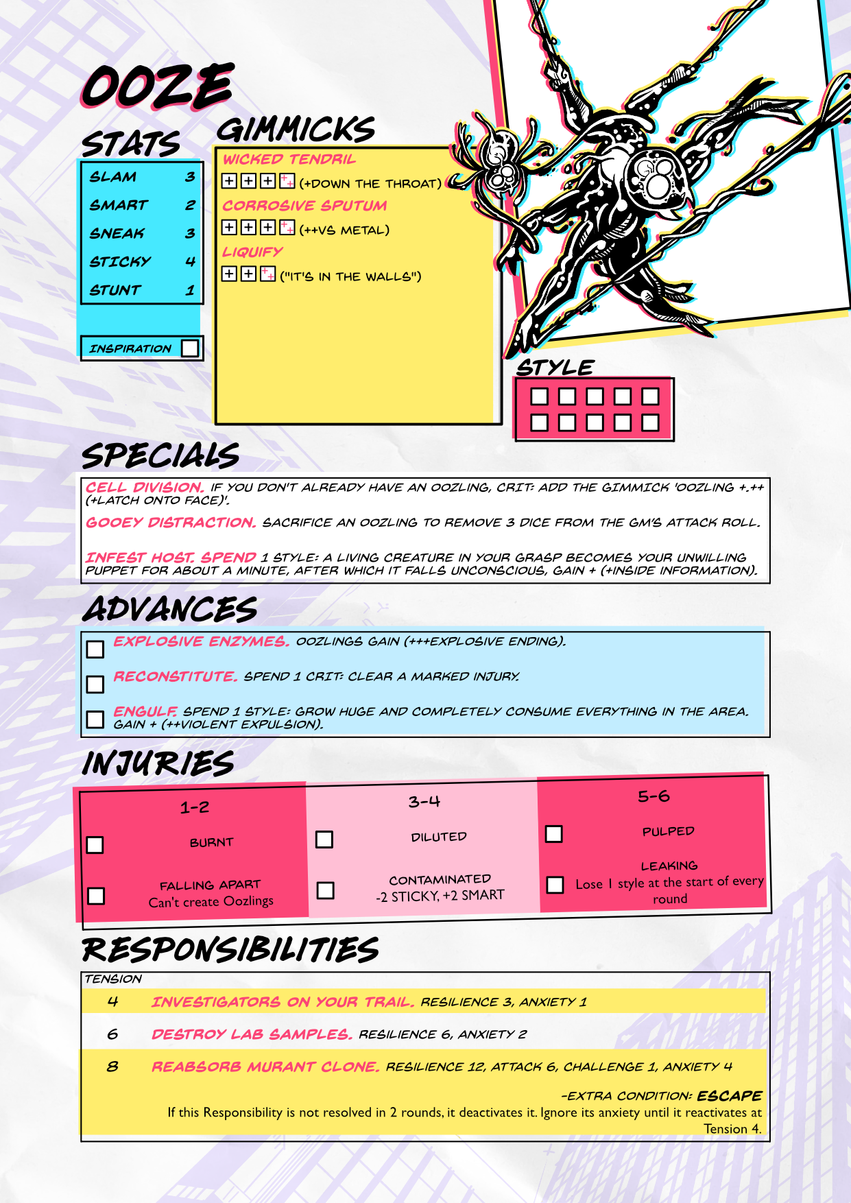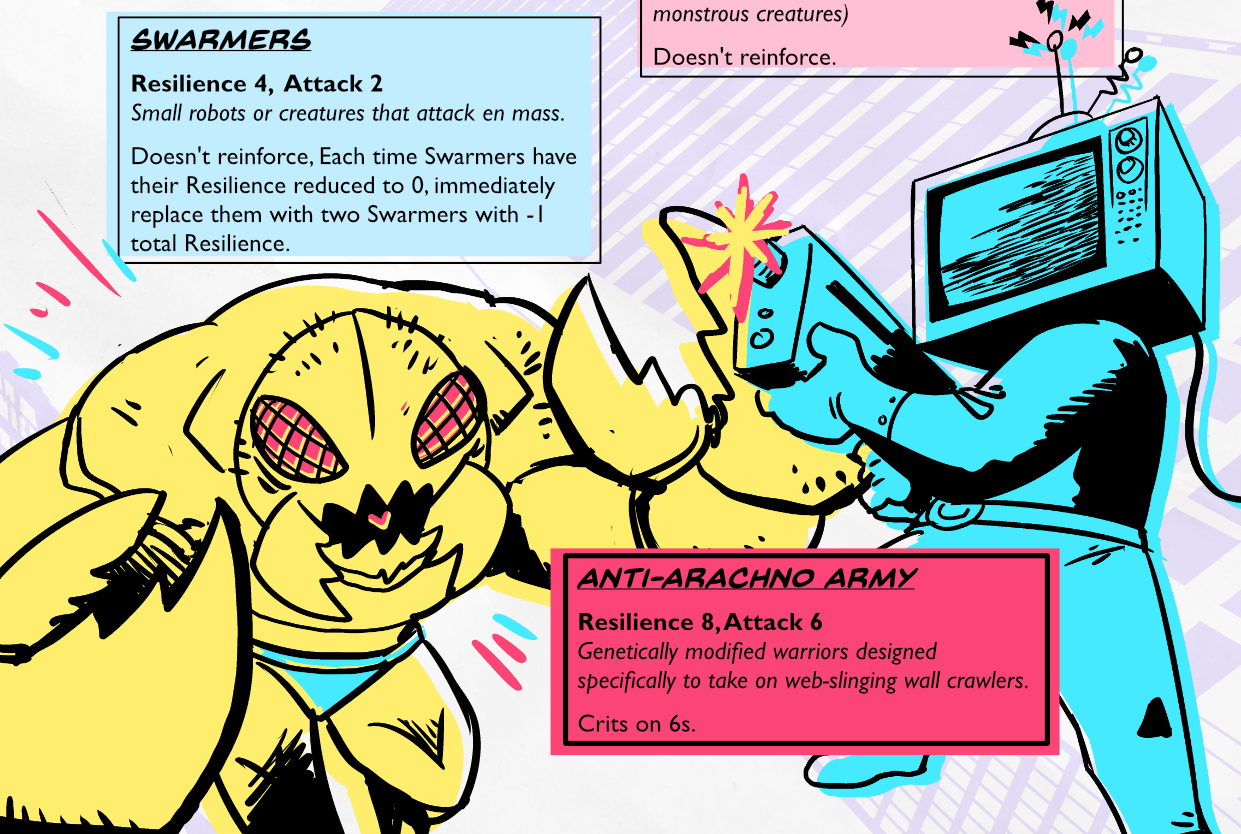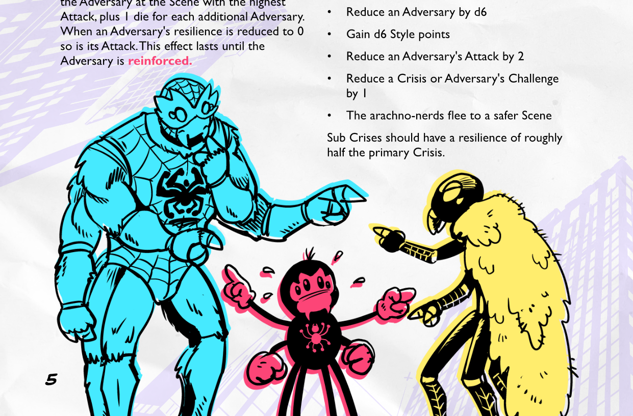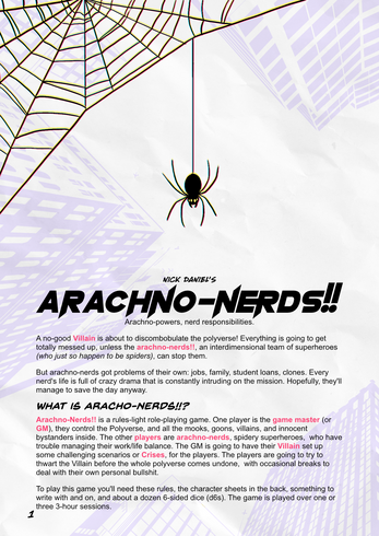 Arachno-Nerds!! is a rules-light role-playing game about thwarting Villains as a team of superheroes (who just so happen to be spiders) who are routinely interrupted by their messy personal lives.